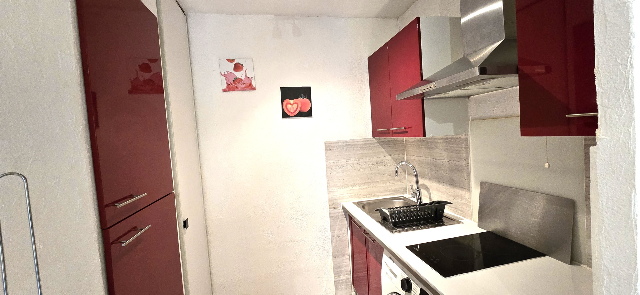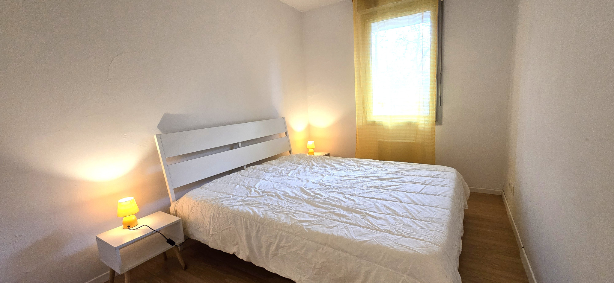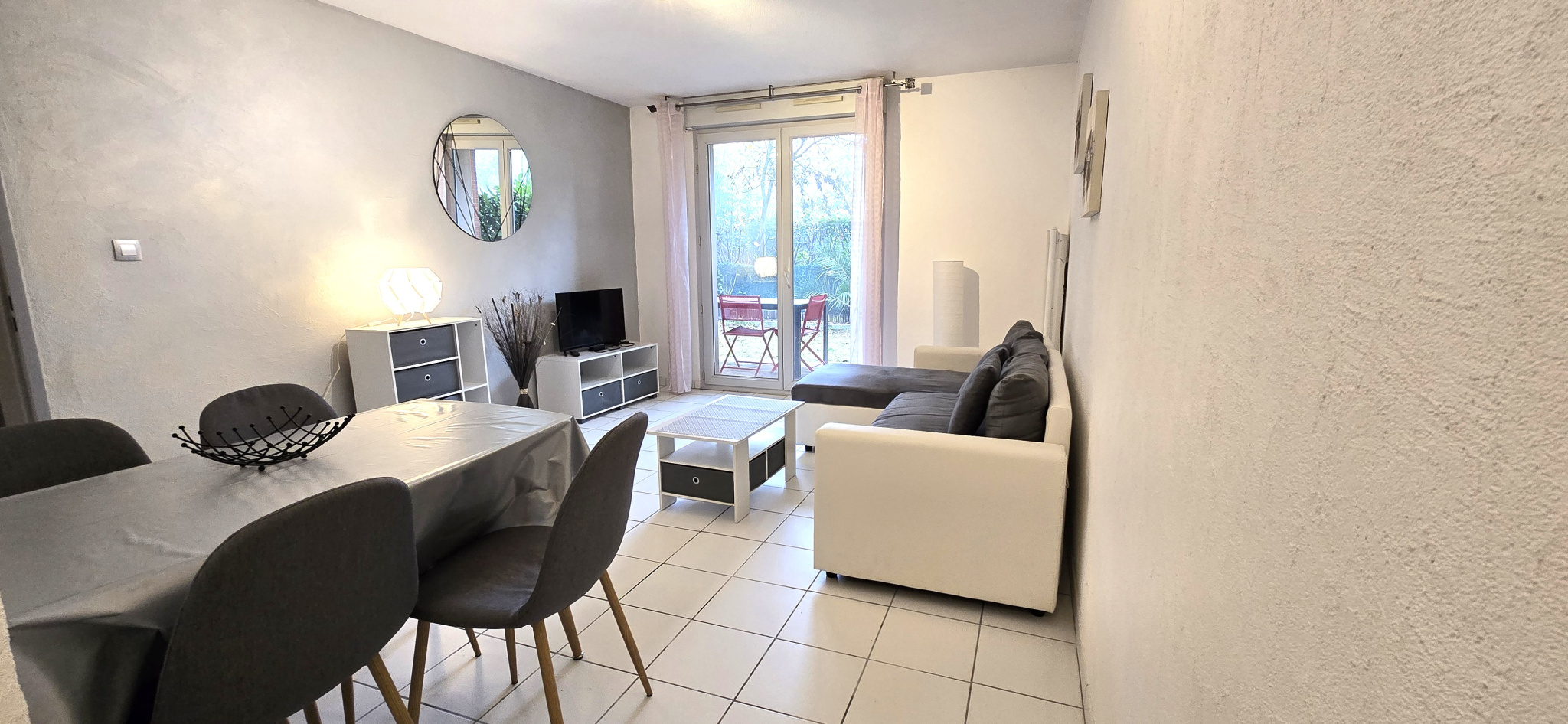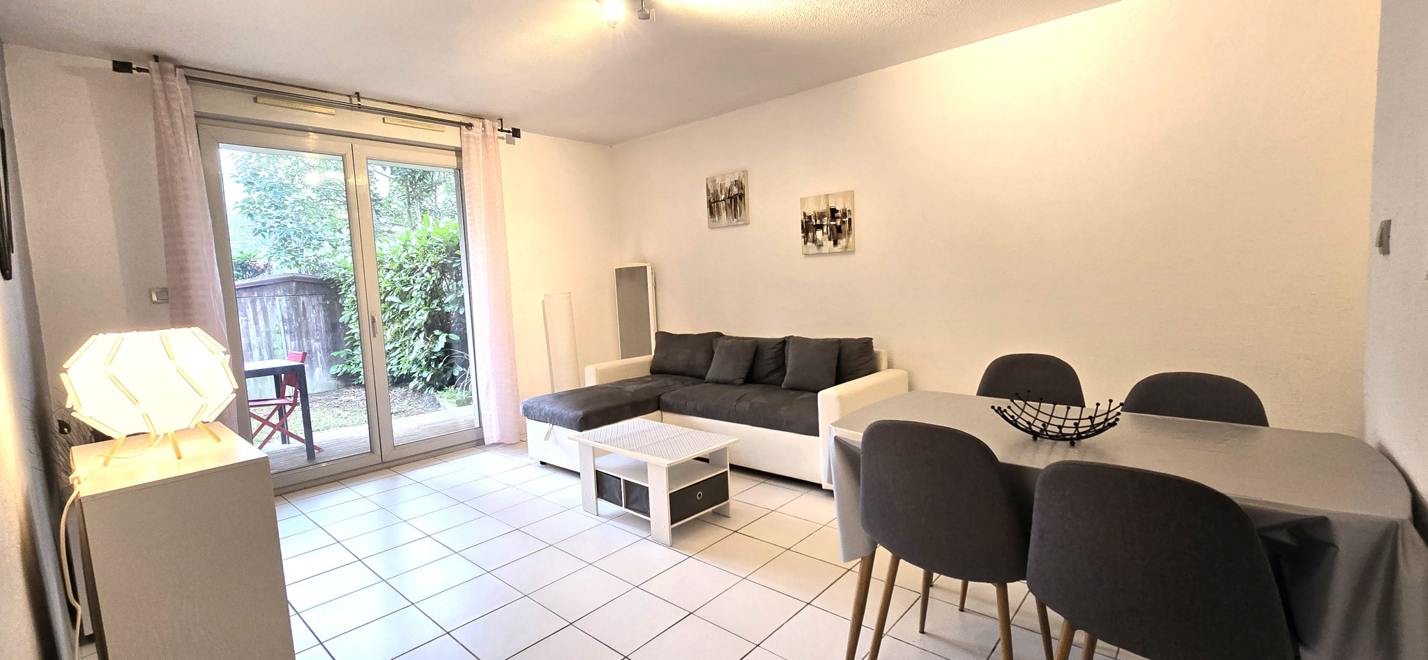 L'appartement se situe à l'arrière du bâtiment. Il s'agit d'un T2 en rez de jardin totalement sécurisé. Il se compose d'une entrée avec placard, d'un séjour ouvrant sur la terrasse couverte et le jardinet, d'une cuisine ouverte entièrement équipée, d'une chambre, salle d'eau et WC séparé.